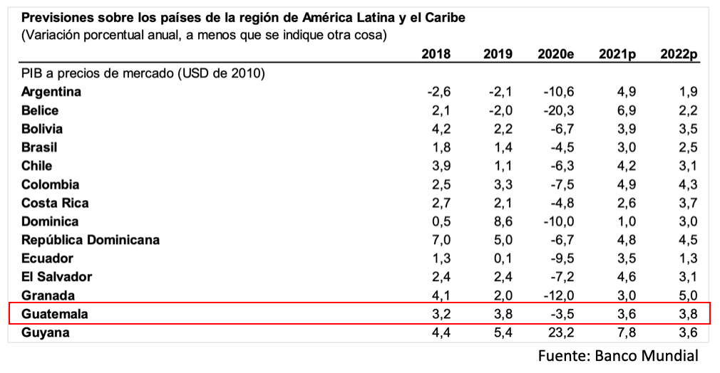 En Guatemala se estima una reducción del PIB del 3.5% en 2020 y un crecimiento proyectado del 3.6% para el 2021.
